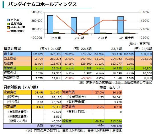 利益も大きく改善。要因としてはコンテンツ事業(ゲーム事業)が78億の赤字から31億の黒字に転じた点が大きいですね。これだけで営業利益ベースでの改善額145億円の殆どをカバーしています。ホビー部門やゲーセン部門もやや改善程度の状況で、全般的に上向き加減です。このまとめ作り始めてから毎年業況の悪化が続いていたので、ようやくの反転に安心感も強いものです。