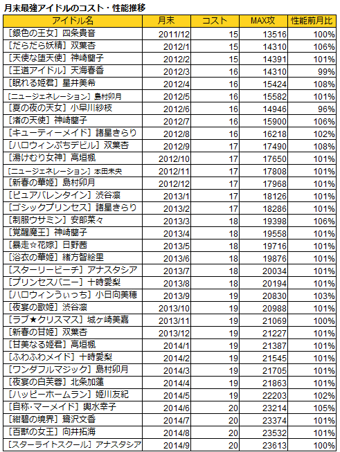 次の表は、当社総合研究所がまとめた月末ガチャにおける攻撃力最強アイドルの推移です。